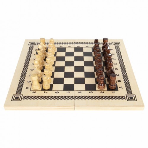 Шахматные фигуры из хвойных и лиственных пород дерева (32 штуки), защитное лаковое покрытие.