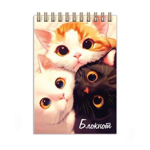Блокнот, А6, 80 л, арт. 74034 ТРИ КОТА / Блок - белый офсет 60 г/м?, клетка, гребень по короткой стороне, сплошной глянцевый УФ-лак,