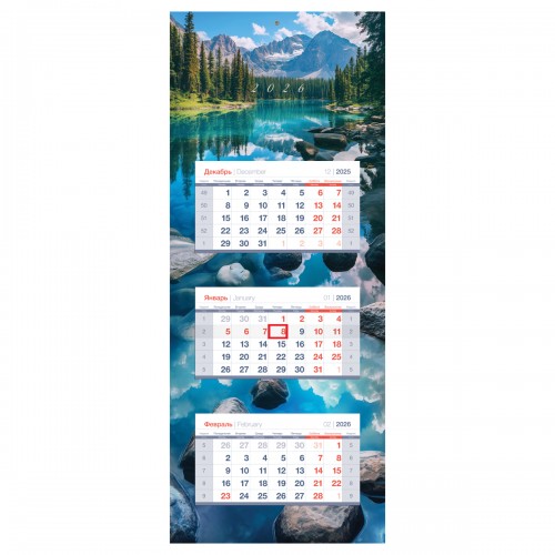 Календарь квартальный BG «Природа» серии «Люкс» на 2026 год – незаменимая вещь в жизни делового человека и отличный помощник для офиса. Размер вертикального календаря – 340*840 мм. Календарные блоки изготовлены из мелованной белой бумаги плотностью 80 гм2 с печатью в 2 краски. Тип скрепления - склейка. Подложка изготовлена из картона с полноцветной печатью. Есть удобный бегунок-курсор и пикколо для подвески.