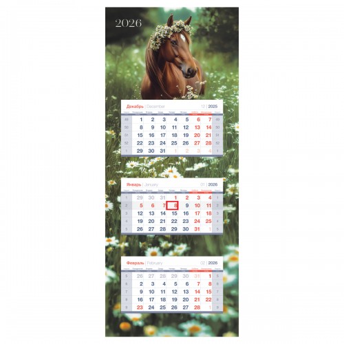 Календарь квартальный BG «Ромашковое поле» серии «Люкс» на 2026 год – незаменимая вещь в жизни делового человека и отличный помощник для офиса. Размер вертикального календаря – 340*840 мм. Календарные блоки изготовлены из мелованной белой бумаги плотностью 80 гм2 с печатью в 2 краски. Тип скрепления - склейка. Подложка изготовлена из картона с полноцветной печатью. Есть удобный бегунок-курсор и пикколо для подвески.