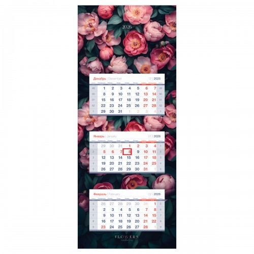 Календарь квартальный 2026г. 'Роскошь цветов' BG, 3 бл. на склейке, 34*84см
