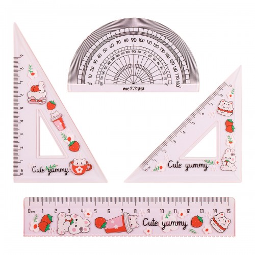 Набор чертежный малый MESHU Милые котята включает в себя: линейку длиной 15 см, два треугольника 30°/60°, 45°/45° и транспортир. Прозрачные линейки нежно-розового цвета из пластика выполнены в милом дизайне с рисунком. А удобный ПВХ-чехол не только обеспечит удобство хранения и использования, но и подарит отличное настроение.