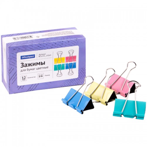 Зажим для бумаги 51мм цветной НАБОР 12шт. OfficeSpace