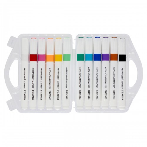 Набор акриловых маркеров ГАММА серии «Классическая» подойдёт для детского творчества и хобби. Набор состоит из 12 укороченных трёхгранных маркеров. Износостойкий наконечник из нейлона. На колпачке и корпусе присутствует вставка, обозначающая цвет чернил. Нумерация цвета есть на колпачке. В наборе 12 цветов. Толщина линии – 1-3 мм, форма наконечника – пуля. Высокие укрывные свойства и стойкость после высыхания. Маркеры не требуют активации, ими можно сразу рисовать на различных поверхностях: бумага, ткань, дерево, камень, пластик, стекло и т.д. Набор представлен в пластиковом кейсе с ручкой и ячейками для каждого маркера.