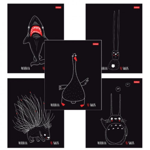 Тетрадь А5 формата содержит 48 листов. Обложка изготовлена из мелованного картона. Дополнена спецэффектом в виде глянцевой ламинации. Внутренний блок состоит из офсетной бумаги плотностью 60 г/м2, линовка в клетку, красные поля. Скрепление: скоба.