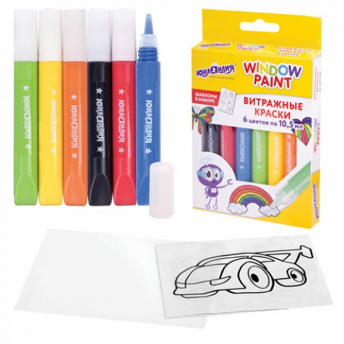 В набор витражных красок входят 6 ярких непрозрачных красок (красный, синий, зеленый, желтый, черный, оранжевый) в тубах по 10,5 мл, книга с шаблонами для рисования и пленка для предварительного создания аппликаций из красок. Готовые самоклеящиеся аппликации можно многократно переносить на любые гладкие поверхности.