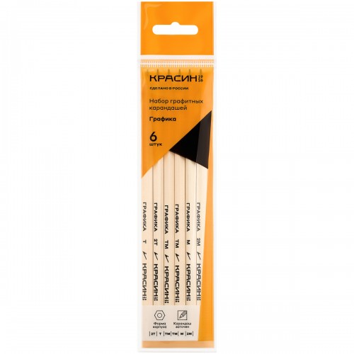 Набор из 6 чернографитных карандашей «Красин» серии «Графика» предназначен для зарисовок, эскизов, рисунков, инженерных и конструкторских работ. В наборе представлены пять степеней твёрдости: 2Т (2Н), Т (Н), ТМ (НВ)-2 штуки, М (В), 2М (2В). Корпус выполнен из дерева высокого качества, имеет шестигранное сечение. Для производства используются сырье и материалы природного происхождения: российская древесина мелколистной липы и графит. Карандаши поставляются заточенными, имеют диаметр 6,4 мм и длину 177 мм. Набор упакован в пакет.
