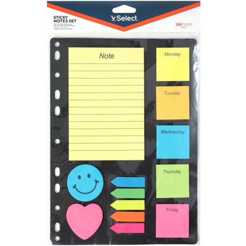 Набор блоков с липким слоем VSelect - незаменимый помощник в организации рабочего процесса. Включает в себя 13 блоков по 20 листов. Специальная вставка с универсальными отверстиями позволяет удобно размещать блоки в тетрадях, регистраторах и папках на кольцах. В наборе есть все необходимое для эффективной организации рабочей или учебной недели: блоки с днями недели, большой блок в линию для заметок, пластиковые закладки-стрелки для выделения важной информации и 2 фигурных блока.