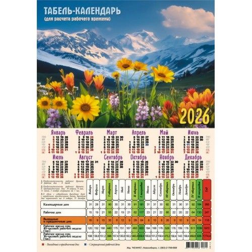 Календарь-табель 2026г. 'Цветы в горах' Келинс, 29,5*20,7см