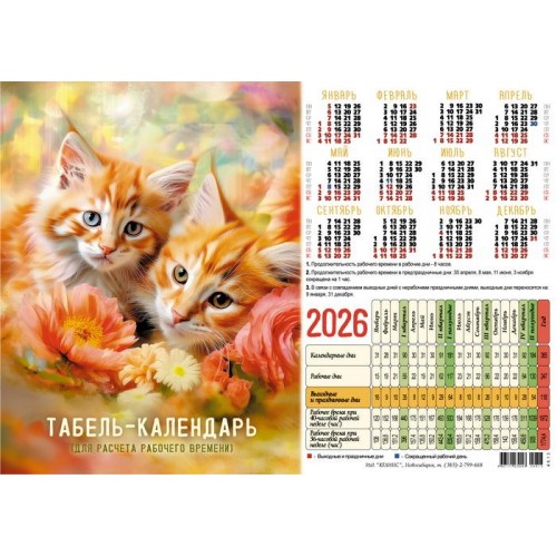 Календарь-табель 2026г. 'Котята' Келинс, 29,5*20,7см