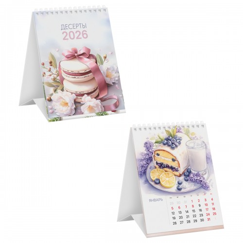Календарь настольный перекидной BG «Десерты» на 2026 год – отличный помощник для офиса. Размер горизонтального календаря – 108*140 мм, тип скрепления – гребень/спираль. Календарь имеет подложку с рисунком и 7 листов. Календарный блок изготовлен из мелованной бумаги плотностью 105 г/м2 с полноцветной печатью. Нижняя подложка изготовлена из картона плотностью 320 г/м2.