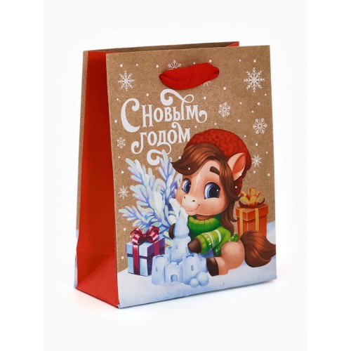 Пакет подарочный 12*15*5,5см 'С Новым годом. Конь' крафтовый, вертикальный