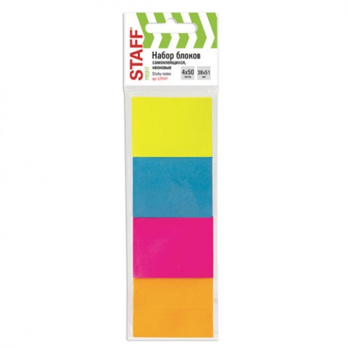 Стикеры 4 неоновых цветов (желтый, розовый, голубой, оранжевый) в форме прямоугольника 38х51 мм состоят из 4 блоков по 50 листов. Плотность бумаги составляет 75 г/м2. Клейкий слой - 22 Н/м. Легко клеятся к любой поверхности. Не оставляют следов. Упакованы в полиэтиленовый пакет с европодвесом.