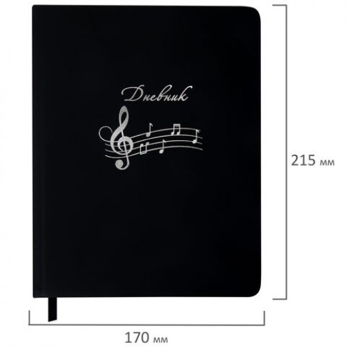 Внутренний блок изготовлен из белой офсетной бумаги повышенной плотности 70 г/м2. Содержит 48 листов для ведения записей и справочной информацией – длительности нот, интервалы, знаки в тональностях, ключи. Обложка выполнена в черном цвете из экокожи – презентабельного и износоустойчивого материала. Элементы дизайна выполнены с помощью термотиснения и фольги. Для удобства использования дневник снабжен закладкой-ляссе.
