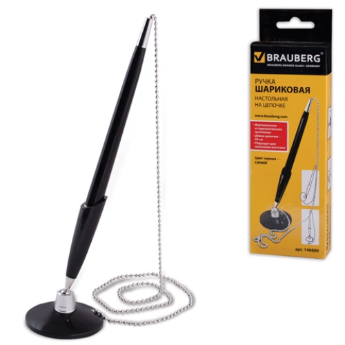 Корпус ручки и подставки - из пластика черного цвета с хромированными деталями. Классический дизайн прекрасно впишется в интерьер любого офиса, информационного бюро и т.п. Фиксируется на любой ровной поверхности с помощью клейкого основания.