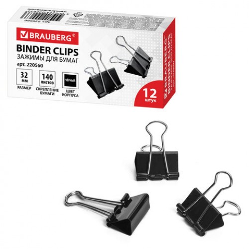 Зажим для бумаги 32мм черный НАБОР 12шт. BRAUBERG