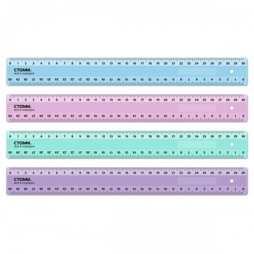 30-сантиметровая линейка «СТАММ» предназначена для выполнения чертёжных и измерительных работ. На корпус нанесены две контрастные миллиметровые шкалы. На линейке предусмотрено место для нанесения имени или другой информации. Ширина изделия — 35 мм. Линейка изготовлена из качественного полистирола, имеет гладкую глянцевую поверхность и безопасные закруглённые края. Упакована в пакет с европодвесом. Цвет изделия — пастельное ассорти.