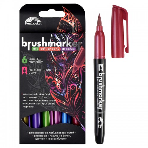 Набор браш-маркеров арт. 62708 / 12 МЕТАЛЛИК (6 цветов (штук) в наборе, размер: 8,3х18х1,7 см, полипропилен, фибра (полиэстер), форма наконечника: кисть, отделка: УФ-печать, металлизированный эффект,